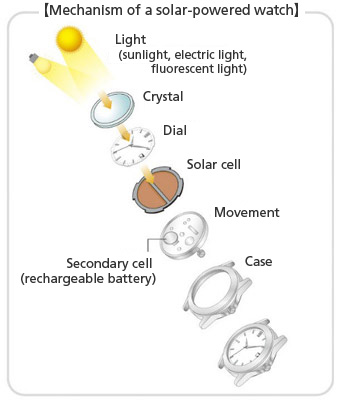 Þannig að, hvernig virka þessi sólar GPS úr? Til að skilja virkni úrsins að fullu þurfum við að byrja á virkni sólarknúinna úra. Skífan á sólarúrum hleypir ljósi í gegn og þaðan í sólarsellu sem hleður lithium rafhlöðu, sem fer í gegnum sama ferli og á quartz úrunum. Þetta þýðir að hægt er að hlaða rafhlöðuna með ljósorku sem sólarsellan breytir í raforku. Hleðslan á rafhlöðunni verður þá ekki tvö ár líkt og með hefðbundnu quartz verkin, heldur verður hún um sex mánuðir sem hægt er að endurhlaða aftur á rafhlöðuna með ljósi, rafhlaðan sjálf endist því lengur á milli þess sem þarf að skipta um hana.