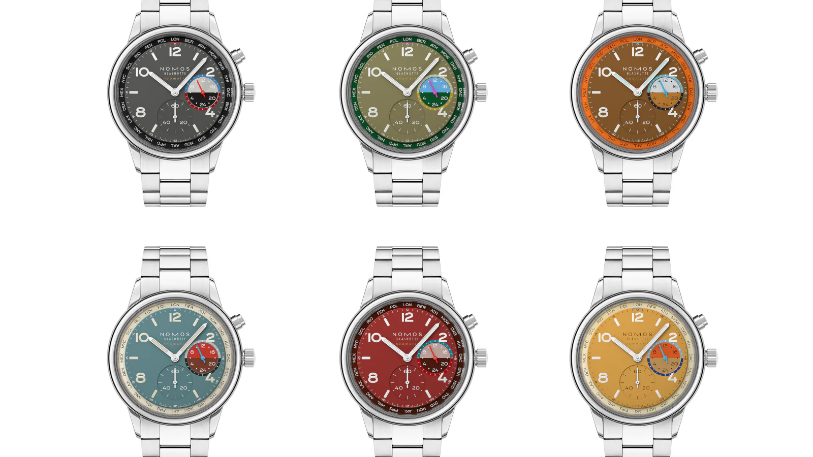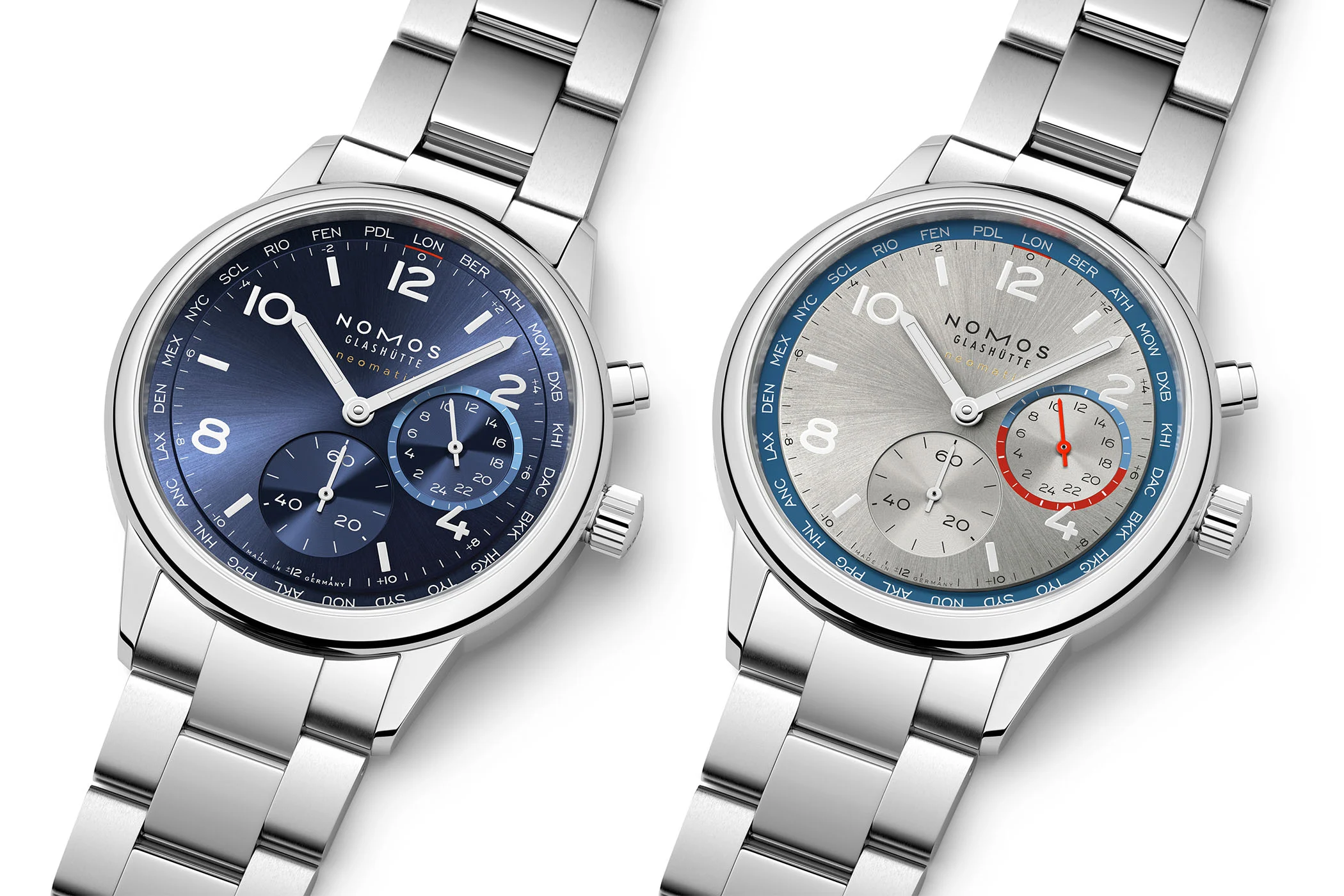 Á þessari heimsklukku frá NOMOS er „undirskífa“ hjá kl. 3 sem telur 24 tíma og sýnir heimatímann, úrið getur því sýnt tvö tímabelti. Snilldin kemur hins vegar fram þegar horft er á ysta hring skífunnar, þar eru mismunandi borgir heims raðað hverri á eftir annarri og með því að ýta á hnappinn á kassanum, hnappinn fyrir ofan krónuna, þá færist klukkustundavísirinn (ekki GMT-vísirinn) áfram um einn klukkutíma og borgirnar færast í öfuga átt um einn. Með þessari virkni er alltaf hægt að sjá heimatímann (tíminn á Íslandi ef þú býrð hér) á 24 stunda undirskífunni og skipta auðveldlega yfir á staðartíma (hvert sem þú ert að ferðast) með einum hnappi. Jafnframt er hægt að reikna út hvað klukkan er í þessum mismunandi borgum.