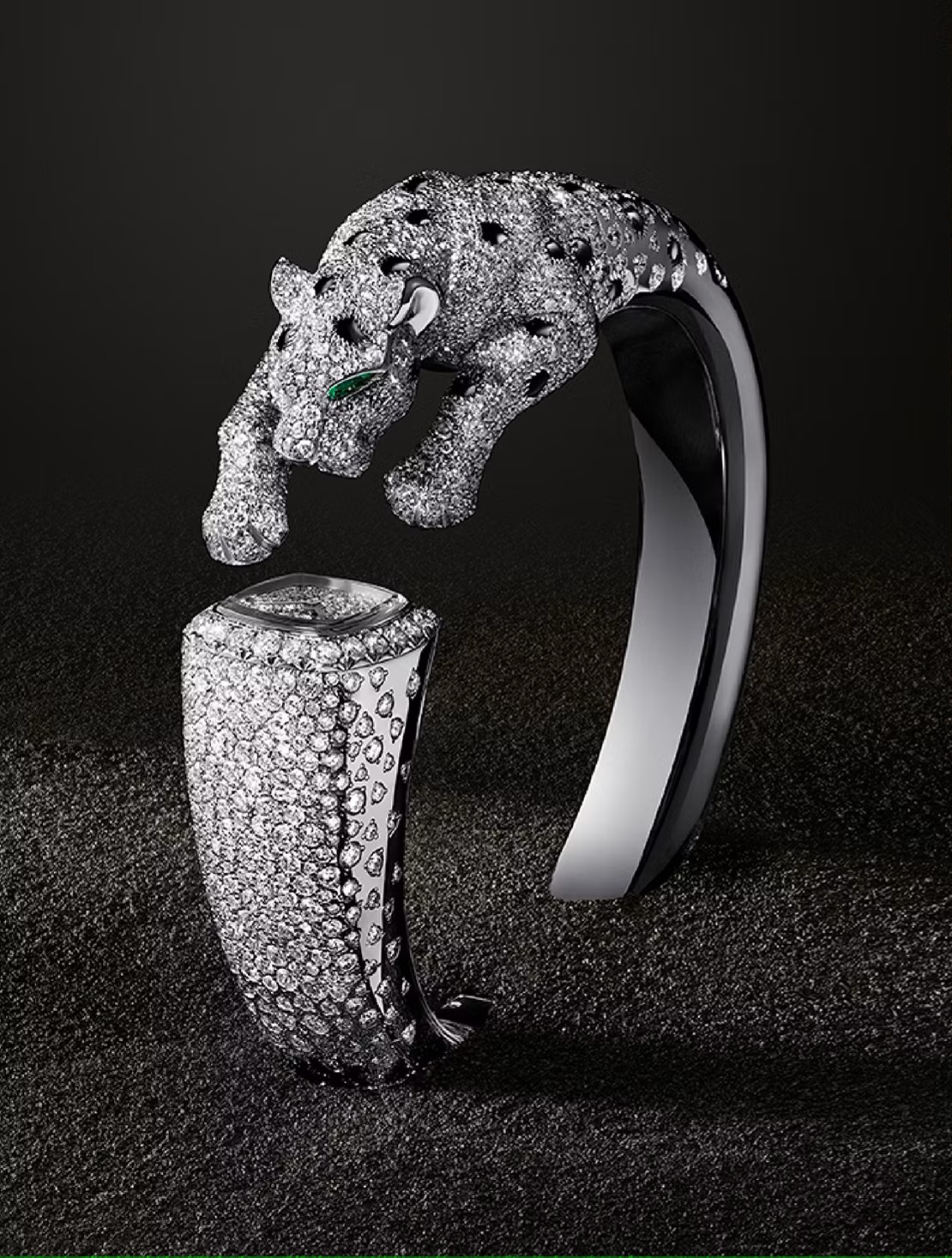 Byrjum á skartgripaúra línu Cartier þar sem tvö ný úr komu út. Eitt er úr hvítagulli og skreytt með 1.103 brilliant slípuðum demöntum sem nemur 11,9ct af demöntum. Augun á pardusnum eru úr smarögðum og er hann einnig skreyttur onyx steinum á nefi og búk.