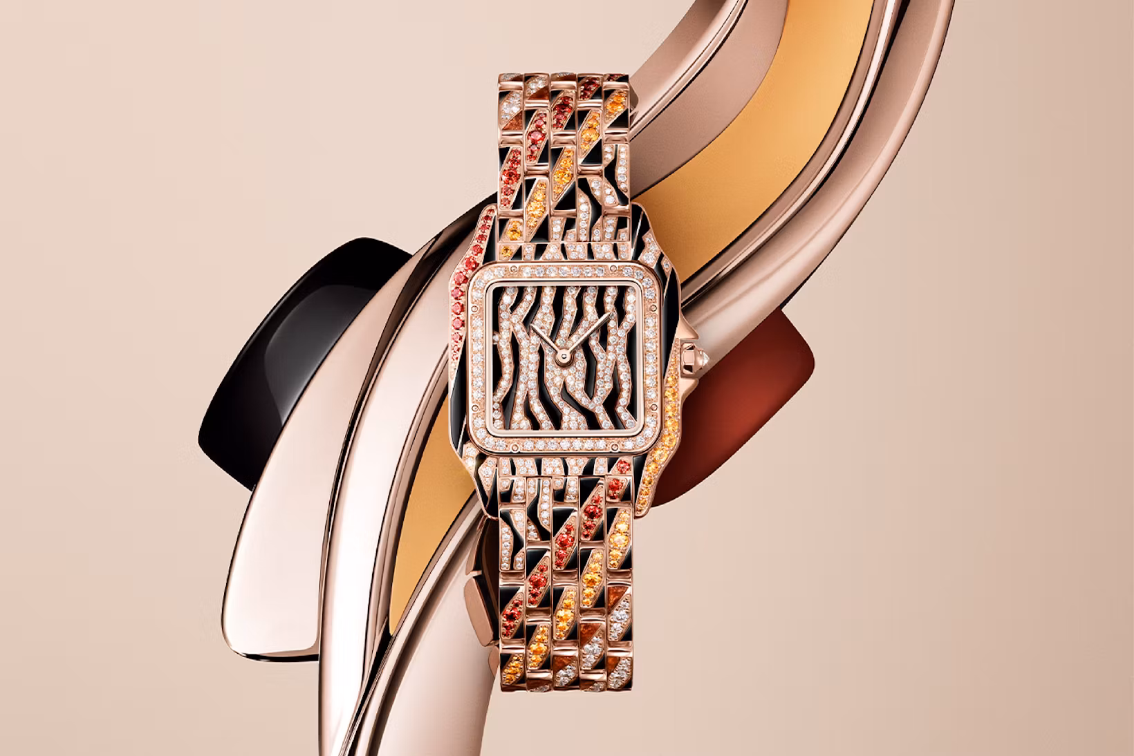 Við höldum okkur í Panthère, og eðalseinarnir fara ekki fet. Cartier gefur hér út þrjú ný úr, það fyrsta er úr rósagulli, steinarnir sem skreyta úrið eru saman settir á sérstakan hátt þannig að úrið líkir eftir tígrisfeldi.