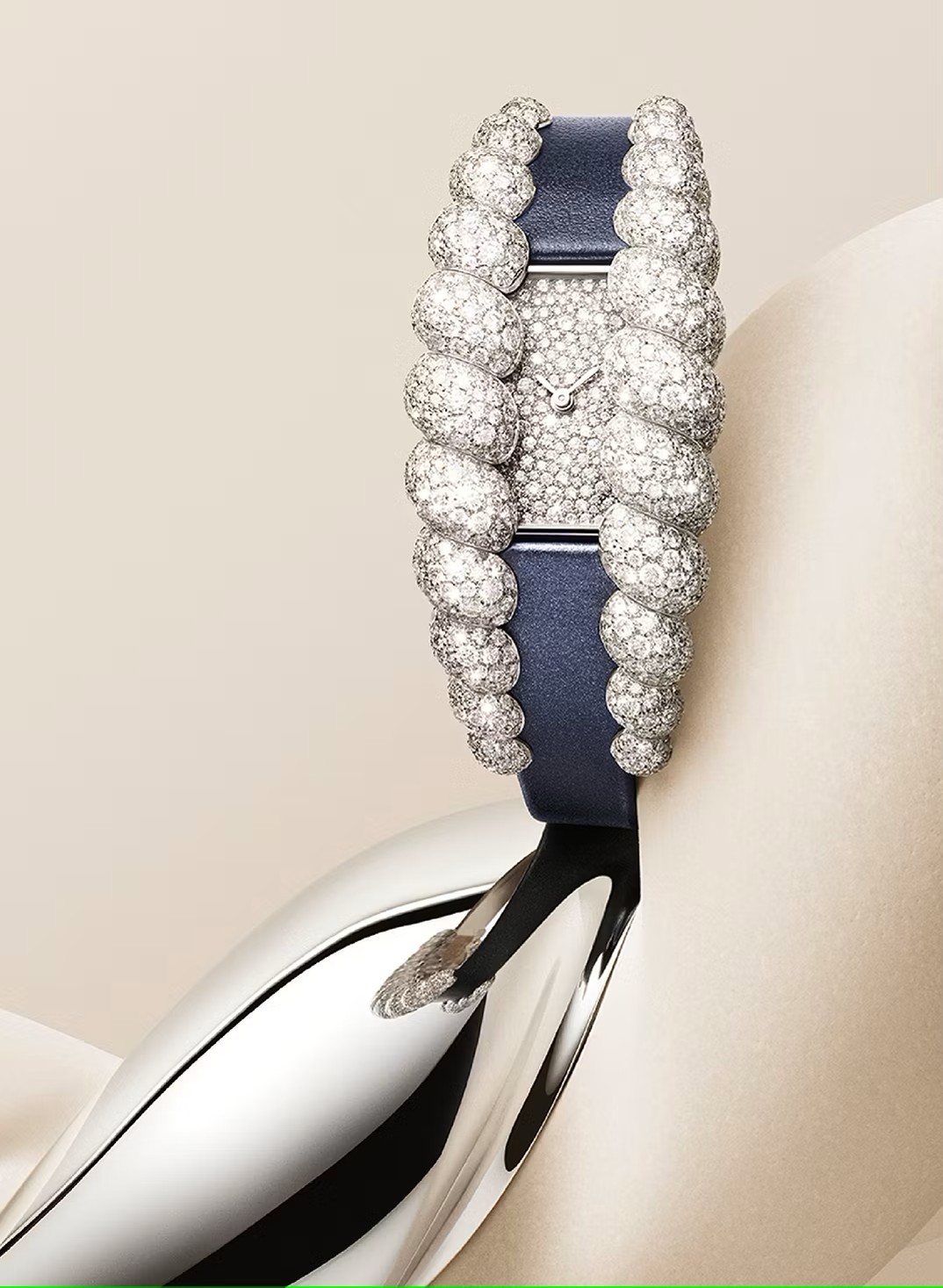 Tressage merkir á frönsku flétta. Innblásturinn og nafnið sést mjög skýrt í nýju Tressage-línu Cartier, hvítagulls útgáfan hefur 916 demanta sem nema 12,3ct.