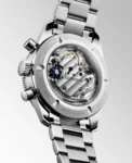 Þá komum við að skeiðklukkunni og því úri sem hefur fengið meiri athygli af þessum tveimur. Líkt og áður kom fram, þá hefur úrið flyback eiginleika en með honum er hægt er að endurræsa skeiðklukkuna án þess að stöðva hana. Þetta hefur mikil áhrif þegar að kemur að tímatöku á hlutum sem gerast hver á eftir öðrum. Fyrri Spirit úr með flyback hafa öll verið 42mm að stærð og með sjálftrekktu gangverki, nýja úrið er í 39,5mm sem er mun klæðilegri stærð og gangverkið horfir til fortíðar, en það er handtrekkt. Gangverkið er einnig betur skreytt en önnur skeiðklukkuverk frá Longines og gefur opna úrbakið góða sýn í það.